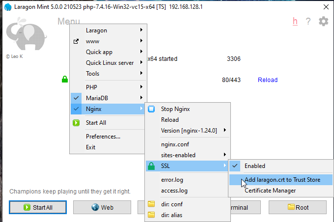 Now restart you Laragon Server, And Enable SSL if you have not enabled it. Then add certificate to trusted list. See bellow screen for help.