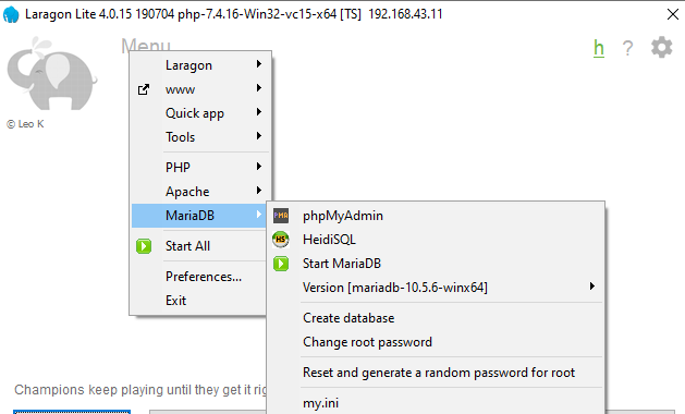 Next, If you have copied MariaDB into laragon/bin/mysql, you will be seeing MariaDB in the menu list, and select your versions from the menu