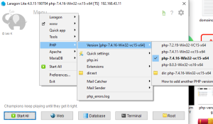 Now open Laragon from the start menu, hover on PHP -> versions -> choose your PHP versions ( you can switch to any version at any time )